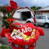 Decoração com corações e laço vermelho, reforçando o tema amoroso.