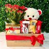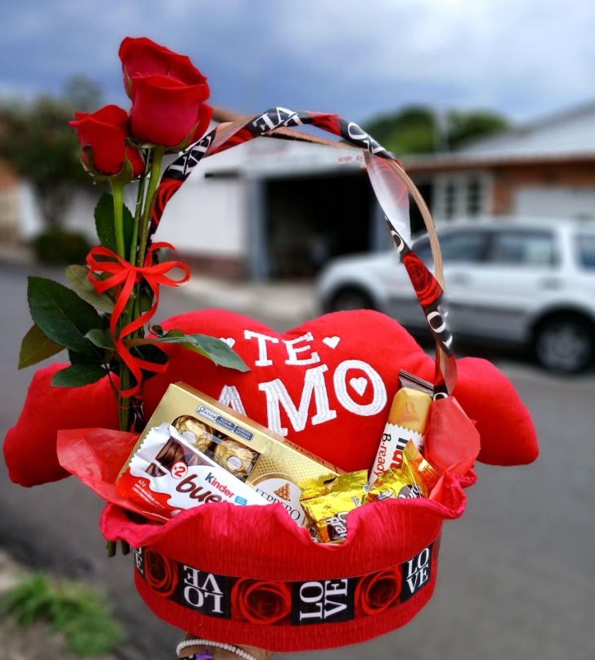 Cesta decorada com tecido e fita temática “LOVE” e detalhes em vermelho e preto — visual romântico e elegante.